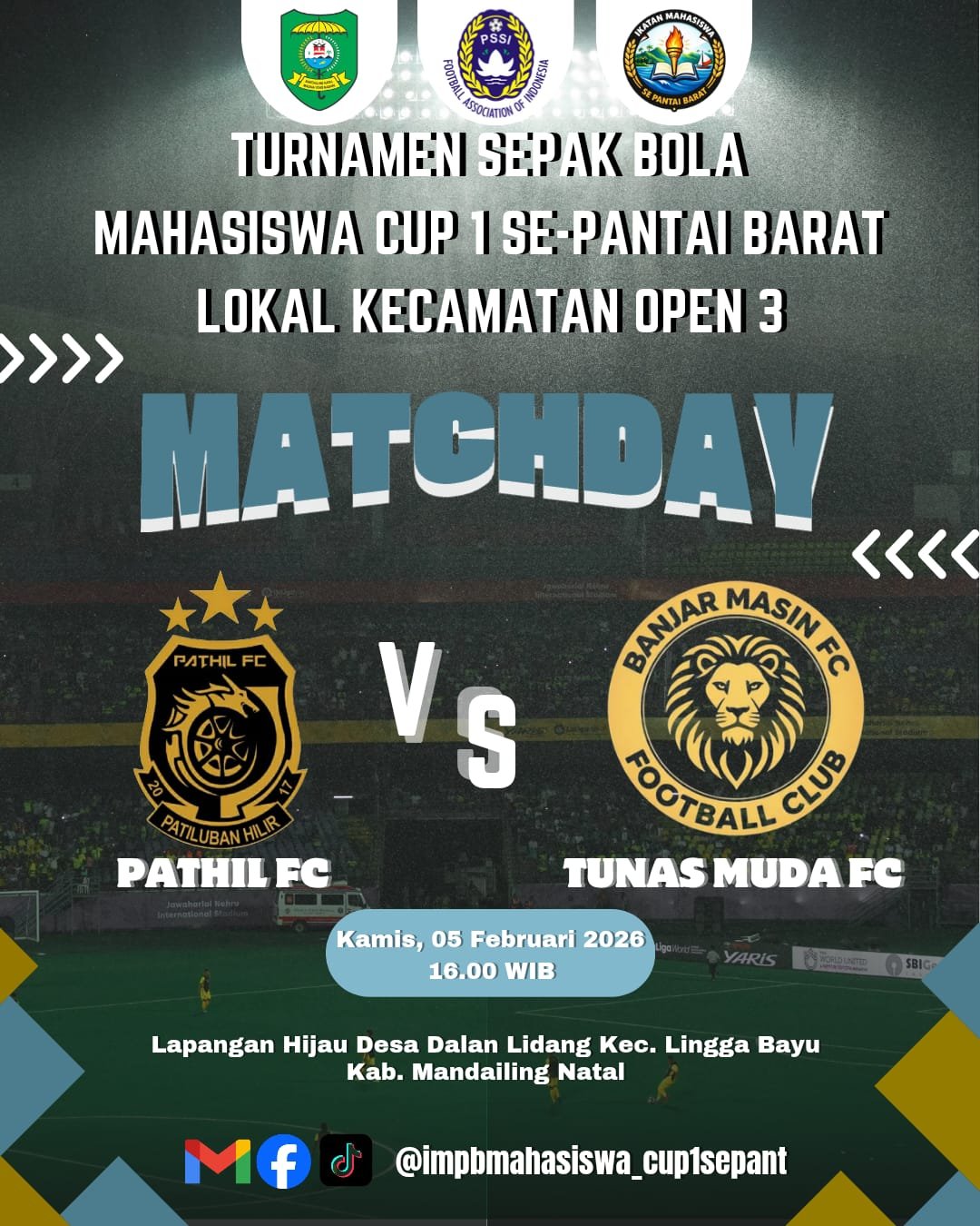 Mandailing Natal | PelindungNegeri.my.id – Atmosfer panas dipastikan menyelimuti Lapangan Hijau Desa Dalan Lidang, Kecamatan Lingga Bayu, pada Kamis (05/02/2026). Dua tim kuat, Fadhil FC Patiluban Hilir dan Tunas Muda FC Banjar Madin Simpang Bajole, akan saling berhadapan dalam lanjutan Turnamen Sepak Bola Mahasiswa Cup I Se-Pantai Barat.
