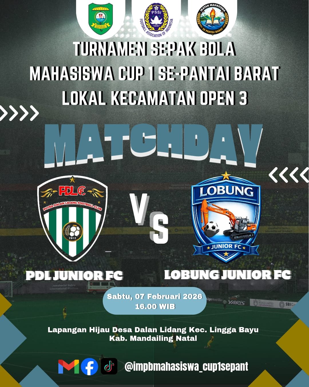Atmosfer sepak bola dipastikan kembali memanas di Lapangan Hijau Desa Dalan Lidang, Kecamatan Lingga Bayu, Sabtu sore (07/02/2026). Tim tuan rumah PDL Junior FC Dalan Lidang dijadwalkan akan berhadapan dengan Lobung Junior FC Lobung dalam lanjutan Turnamen Sepak Bola Mahasiswa Cup I Se-Pantai Barat.