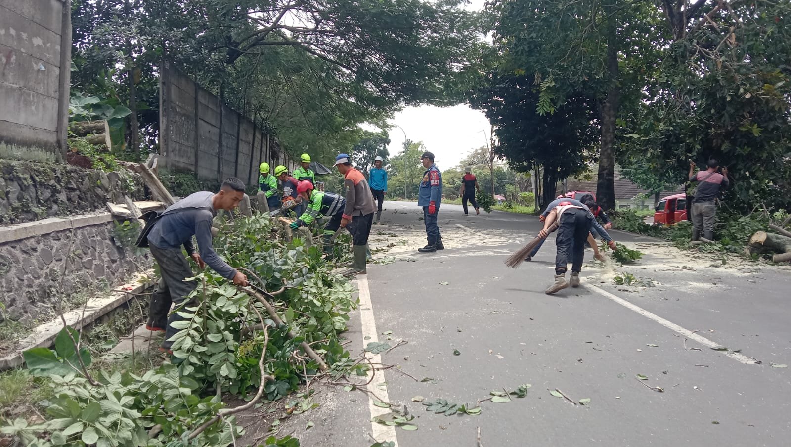 Proses penanganan dilapangan dilakukan dengan pemotongan pohon tumbang yang melintang di badan jalan dengan menggunakan empat alat pemotong gergaji mesin,serta pembersihan sisa material dan melakukan pengamanan jalan sekitar lokasi untuk mengantisipasi terjadinya bahaya pungkasnya.