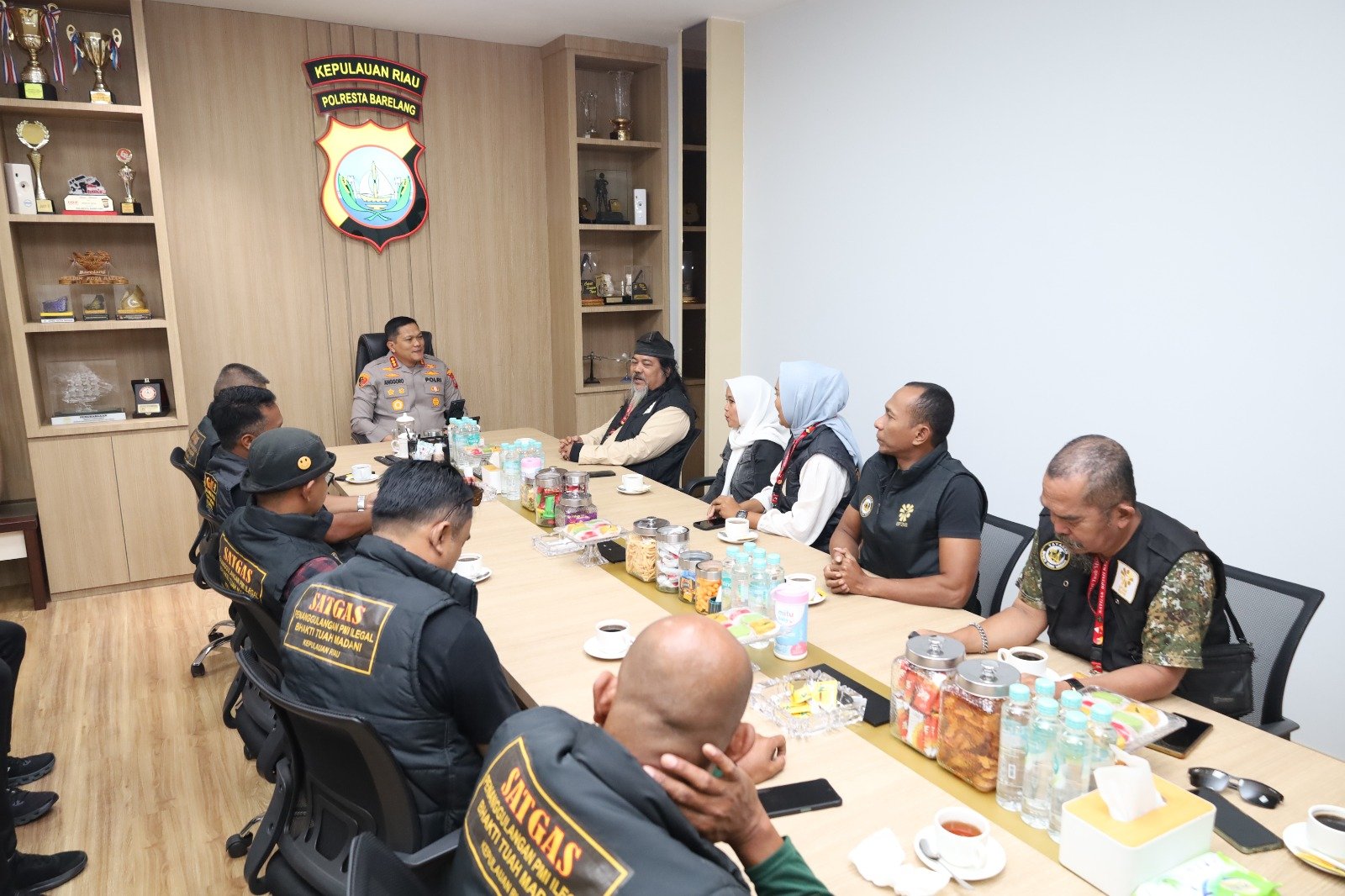Rombongan Satgas PMI Bhakti Tuah Madani dipimpin oleh Ketua Umum DPW Satgas Bhakti Tuah Madani, Udin, didampingi Sekretaris Jenderal dan jajaran pengurus. Mereka diterima langsung oleh Kapolresta Barelang Kombes Pol Anggoro Wicaksono, S.H., S.I.K., M.H., di ruang Kapolresta lantai 2 Gedung Polresta Barelang.
