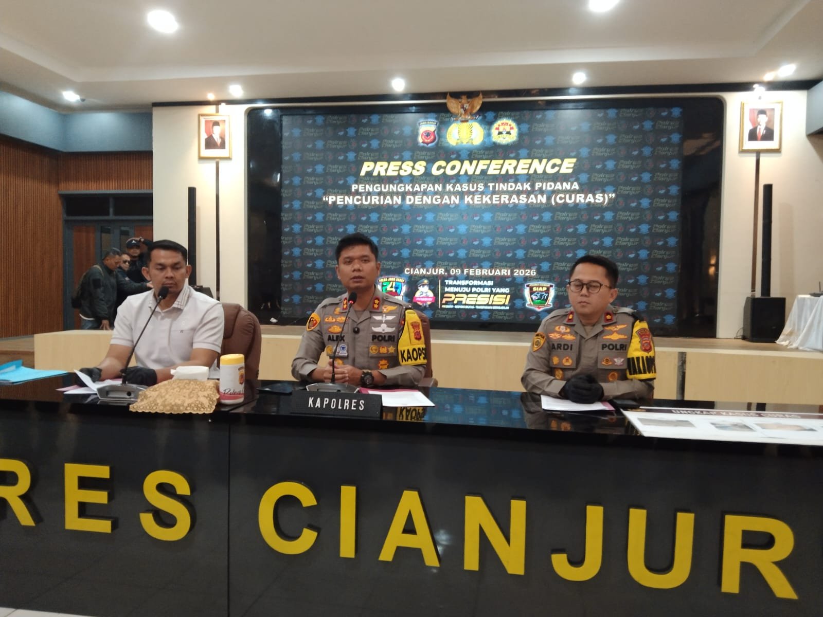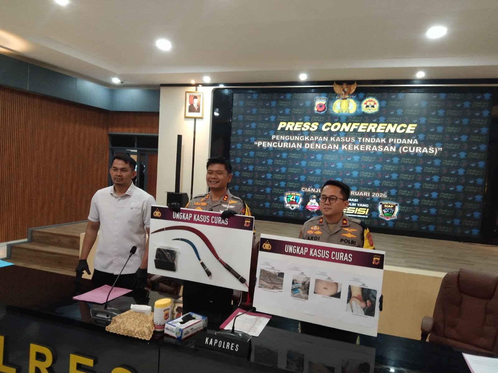 CIANJUR Jabar | Pelindungnegeri.my.id Reserse Kriminal bertempat di aula polres Cianjur pada hari Senin 09/02/2026 (Satreskrim) Polres Cianjur berhasil mengungkap kasus pencurian dengan kekerasan yang terjadi beberapa waktu lalu di Warungkondang, Cianjur.