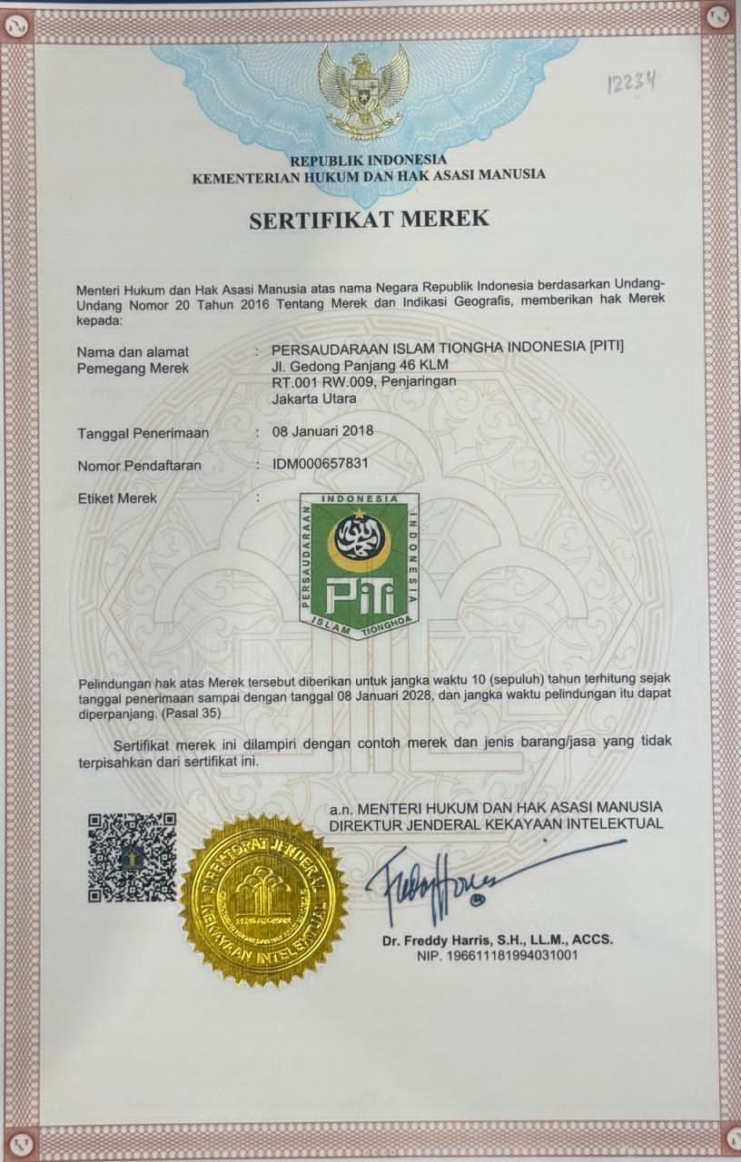 Berdasarkan Sertifikat Merek Nomor IDM000657831, merek Persaudaraan Islam Tionghoa Indonesia (PITI) diajukan pada 8 Januari 2018, terdaftar pada 29 Oktober 2019, dan berlaku hingga 8 Januari 2028. Sertifikat tersebut diterbitkan setelah melewati seluruh tahapan pemeriksaan formalitas, pengumuman, dan pemeriksaan substantif sebagaimana diatur dalam Undang-Undang Nomor 20 Tahun 2016 tentang Merek dan Indikasi Geografis.