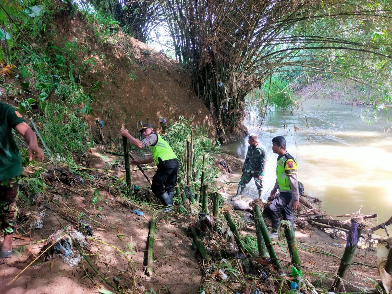 Sinergi Tanpa Batas! Polisi, TNI, dan Warga Pangkah Gotong Royong Bendung Longsor di Pinggir Sungai