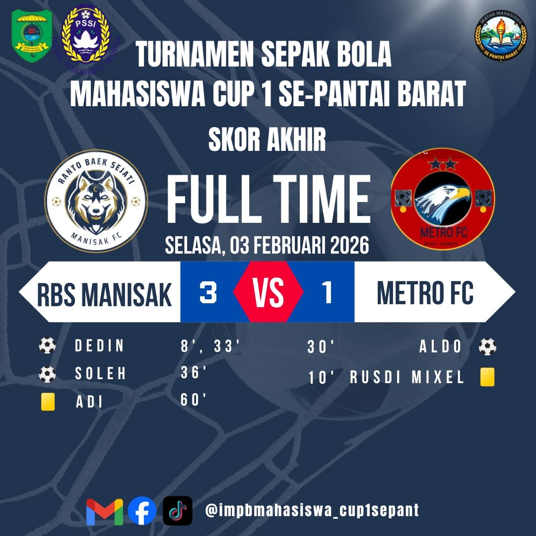 Hingga peluit akhir dibunyikan, RBS Manisak tetap tampil konsisten menjaga keunggulan. Kemenangan ini mengukuhkan posisi mereka sebagai salah satu tim kuat dan kandidat serius juara di ajang Mahasiswa Cup I Se-Pantai Barat.