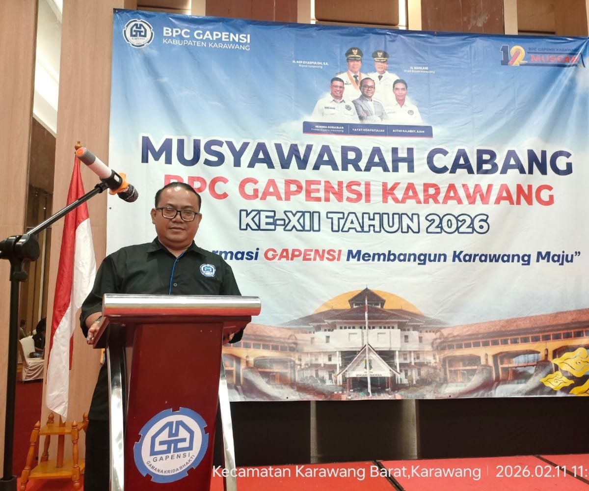 KARAWANG,JABAR | Pelindungnegeri.my.id- Badan Pengurus Cabang (BPC) Gabungan Pelaksana Konstruksi Nasional Indonesia (Gapensi) Kabupaten Karawang menggelar Musyawarah Cabang (Muscab) ke-XII Tahun 2026. Kegiatan tersebut dilaksanakan di Hotel Swiss-Belinn Karawang pada Rabu (11/02/2026).